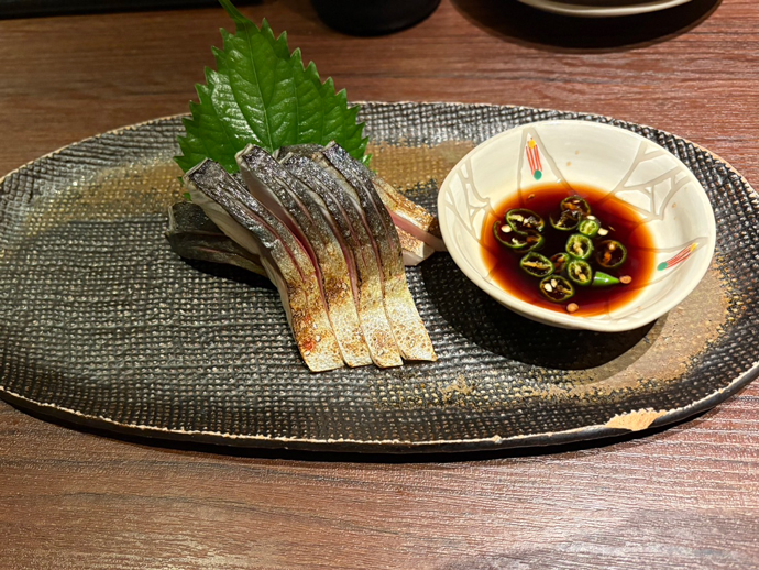 文字通り炙ったサバを青唐辛子と濃い口醤油のつけダレにつけて頂くんだけど、コレがまずもう絶品!あぶらと辛さと甘みが全て計算し尽くされた他では味わったことのないお味。