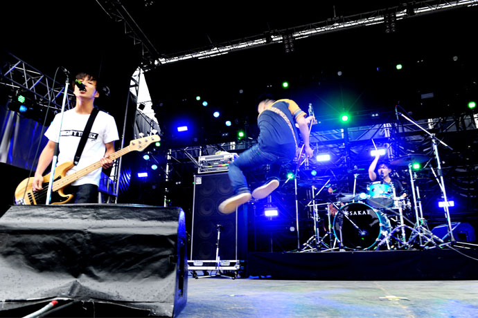 2日目に雨が降ると予報されていたはずなのに、早くも雲行きの怪しい1日目。シトシトと朝から雨が降り続ける中、トップ・バッターのSHANKがスタート!「Long for the Blue moon」「Cigar Store」「Time is...」とフルスロットルのSHANKに、オーディエンスは待ってましたとばかりにのっけから続々とダイヴ!その場にいる誰もがトップギアでアクセル全開だ。"長崎のSHANKです!よろしくお願いします!"と、庵原将平(Vo/Ba)。気づけば、ステージ袖には今日出演するたくさんのアーティストが彼らのパフォーマンスを見守っている。そんな中、SHANKの熱いアクトが加速していくにつれスカダン、モッシュ、ダイヴとオーディエンスは雨をものともしない。"大作戦の大きなステージに立つにあたって、自分のことのように喜んでくれる人がたくさんいる。本当にありがとう。これから俺たちが何を守って、何を壊していくのか。興味がある人は見ていてください!"とSHANKは自らの未来を叫び、ラストに京都大作戦に初めて出演したときに演奏したという「submarine」で情熱的に締めくくった。
