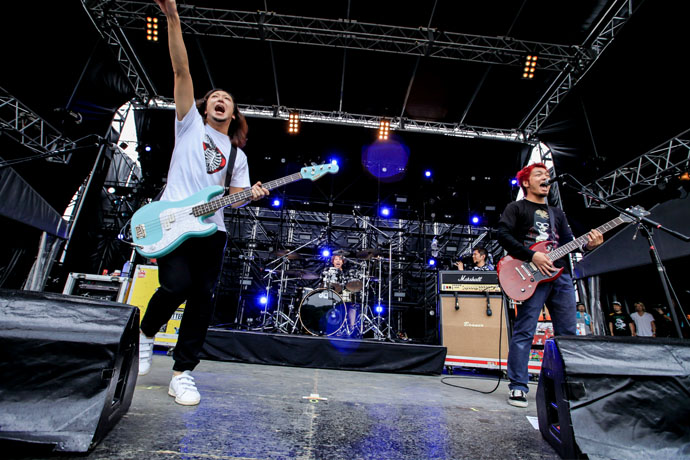 真っ赤な髪の毛が特徴的な難波章浩率いるNAMBA69が登場。リハの時点ですでにオーディエンスはあたたまっていたこともあり、1曲目「MY WAY」のサビが聴こえた瞬間ダイバー続出!その数の多さで、ステージ上にいるはずのバンドがほとんど見えなくなるほどの勢い!"みんな地元を愛していますか? オレは京都を愛してます!みんながそれぞれ地元を愛すれば、もっと日本が良くなるはず"と伝え、パンク・バージョンの「カントリーロード」に繋ぐ。DAFT PUNKの「One More Time」で牛若ノ舞台 本日1番のサークルを生み出し、ラストに乱入してきたJESSE(RIZE/The BONEZ)とのコラボ曲「LET IT ROCK」で完全にオーディエンスをLOCK!いつまでも止まらずROCKし続ける難波章浩の姿に圧倒される30分だった。