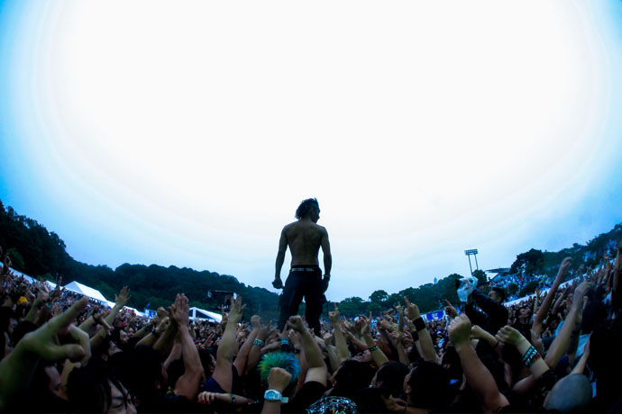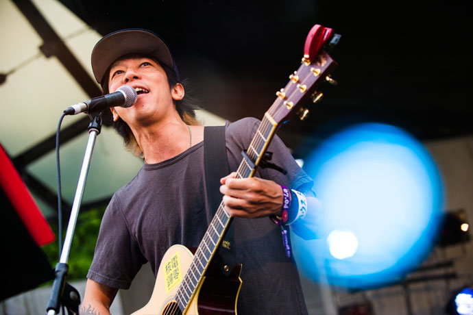 雨が降り続く中、足早に移動したにも関わらず早くも入場規制となっていた細美武士による弾き語り。1人で寂しくなったのか、観に来ていたTOSHI-LOW(BRAHMAN)を呼び込み急遽the LOW-ATUSとして披露したのはBRAHMANの「PLACEBO」。人の波の上に立つTOSHI-LOWの姿を見た細美は"この光景見たことある!俺もやりたい!"と叫んだのだが、それは後々メイン・ステージで実現するフラグとなった。そして、細美が最後に1人で届けたのは、ELLEGARDENの「Make A Wish」。そこにいたすべての人が大きな口で"願い事をかけよう"と大合唱。雨が降り続けていたのに、まるでそこだけ青空が広がっているかのような気持ちに誰もがなったはず。そうさせてくれる細美の清々しい笑顔が最高に晴々としていたステージだった。