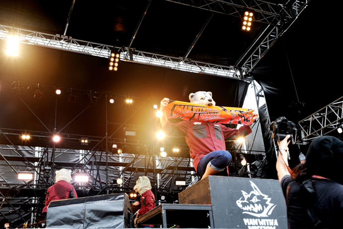 1ヶ月もの間、ヨーロッパ・ツアーを突っ走っていたオオカミたちは久しぶりの日本でのライヴだという。"ステージ上ニオオカミガイルノハ、ドコ二行ッテモ俺タチダケデシタ......。ダカラ日本二帰ルト、コンナニ愛シテクレル アナタタチガイルカラ最高ナ気分デス。マタ日本デガウガウスルゾ!"と叫ぶと同時に始まった「database feat.TAKUMA」。数々の乱入を試みている10-FEETのTAKUMAが痛快なステップを踏みながら登場!同時に速攻で沸点に到達するオーディエンスはもう止まることを知らない。ラストに放った「FLY AGAIN」でメイン・ステージに集まっていた2万人が狂喜乱舞!京都大作戦でも狼旋風を巻き起こしたMWAMは、納得のモンスター・バンドだった。