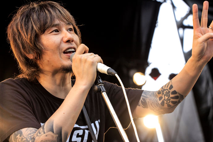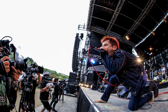 今年で3年連続3回目の登場となったKen Yokoyama。続けていこう、繋げていこうと歌うKen Bandのテーマ・ソング「Let The Beat Carry On」からスタート!京都大作戦2日目も終盤へと差し掛かってきたにも関わらず、疲れを知らないオーディエンスは恒例のモッシュ&ダイヴ! 準備運動のような1曲が終わると、おもむろに日の丸を背負う横山健。"日の丸を見ると、なんで嫌な気持ちになるのか。まずはその違和感から考えてみよう。もしかしたらロックンロールが教えてくれることってそういうことかもしれないぜ!"楽しいのはもちろんだが、それだけではない彼からのメッセージはいろんなことを意識させる。震災をキッカケに考え方や他人に対する接し方が変わったという横山が、新曲を歌う前に"なんかもうカッコつけてる場合じゃなくなったんだよ!今ここにいる2万人は凝縮された2万人で、日本は思ったよりも大きい!ロックンロールのロの字も知らない人が多いんだ。そういう人のところに入っていかないとって気持ちが芽生えた。もう四の五の言ってられないんだ!"と語ったあとに「I Won't Turn Off My Radio」を聴かせてくれた。いつもハッとさせる言葉で熱く心を揺さぶっていくKen Yokoyama。来年はどんな話を聴かせてくれるのだろうか。今から楽しみで仕方がない。