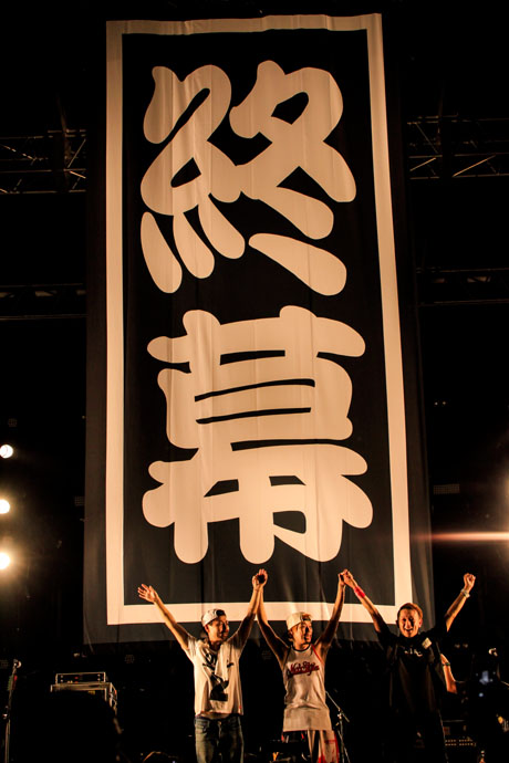 最高のあたたまり具合でバトンを渡されたのは、京都大作戦の首謀者でもある大トリ、10-FEETだ!ゆっくりとステージに上がる3人は真ん中に集まり、いつものようにキスをして定位置に。TAKUMA(Vo/Gt)が"最後まで怪我すんなよ!仲良くしろよ!"と叫んでスタートしたイントロは「風」。TAKUMAが"1曲ずつ終わるたびに俺たちの正月が終わっていく"と言葉を聞いてちょっとだけ切なくなる。「VIBES BY VIBES」で競うようにシンガロングし、重厚なベースから始まる「super stomper」のイントロが聴こえてくるとTAKUMAがMAN WITH A MISSIONのトーキョー・タナカとジャンケン・ジョニーを呼び込む。放たれた獣のように走り回る2匹は大興奮でオーディエンスに飛び込む!「River」では歌詞を"鴨川"や"宇治川"に変えてその場にいる全員でシンガロングし集まったすべての人がひとつに。"つらいことや我慢しないといけないことはたくさんあると思うけど、後悔のないよう生きて欲しい"と気持ちを込めて歌われたのは「蜃気楼」。伝えたいことは山ほどあるかのように歌い終わってもTAKUMAは叫ぶ。"忘れないといけないけど、忘れられないこと。忘れないといけないけど、忘れずに向き合わないといけないこといっぱいあるな!でも、負けてたまるか!"と言葉を詰らせながらも吐き出すと「その向こうへ」では、ROTTENGRAFFTYのNOBUYAとN∀OKIが乱入。盟友と一緒に披露される「その向こうへ」はまたひとつ違い、いつもよりもエモーショナルに聴こえてくる。そして、ラストに作り上げた過去最高にでかいサークルで「goes on」!アンコールでは、1日目に"お前らは友達だから"と披露してくれた未完成の新曲と、「DO YOU LIKE...?」に続き、1年に1度だけ見れる花「CHERRY BLOSSOM」、そして誰が歌っても名曲は名曲だと言い放ち、Hi-STANDARDのカバー「Stay Gold」でその場にいたすべてのオーディエンスが狂喜乱舞し、無事終演を迎えた。