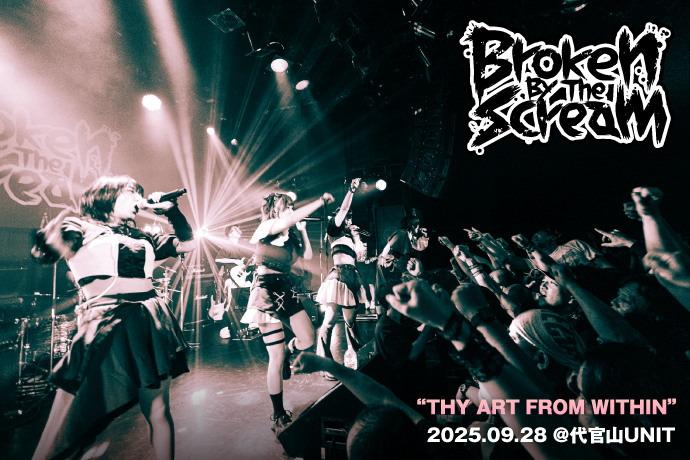 現体制となって初のフル・アルバム『Solar Strain』を8月にリリースしたメタル系スクリーミング・アイドル Broken By The Scream(以下:BBTS)が、9月28日に代官山UNITでバンド・セットによるワンマン・ライヴ"THY ART FROM WITHIN"を開催した。フル・アルバムとしては前作『RISE into CHAOS』から約3年ぶり、4作目となる『Solar Strain』。この数年の間にメンバー交代はありながらも、精力的に海外でも活動を行い、ヨーロッパでの単独ツアーや、タイ、韓国等アジアでも公演を実施し、海外の大型フェスにも出演。来年2026年には世界最大級のメタル・フェスと言われるドイツの"Wacken Open Air"への出演も決定しており、グループとして加速しているなかでのアルバムには、ライヴでの新たなテッパン曲や、14分を超える壮大な組曲「追憶のナスカ」といった挑戦的な曲等、全11曲が収録された。今回のワンマン"THY ART FROM WITHIN"はその最新曲と、現体制の4人、野月平イオ、七々扇ツバキ、御子神シズク、鷹屋敷ヤヨイで最新型へとアップデートされた定番曲とによる、最強セットリストでのライヴとなった。