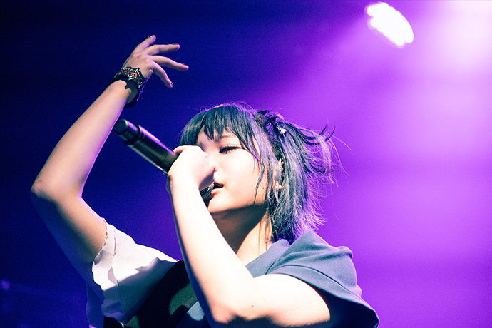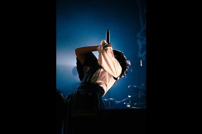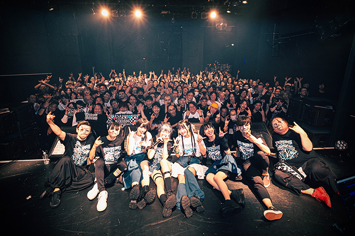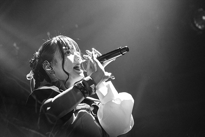 後半へと折り返してのMCでは、BBTSが好きで2023年末にグループに加入したシズクが、アルバムのリリースやこうしてライヴで温かく迎えられている喜びに言葉を詰まらせながら、"どんどんこの4人で大きくなって、皆さんに新しい景色を見せたい"と語った。その後半のハイライトはなんといっても、14分超の大作「追憶のナスカ」の初披露だ。アルバムやミュージック・ビデオでもダイナミックに多ジャンルが展開していく曲の面白さや4人の表現力を味わえるが、ライヴではさらにドラマ性が増す。ダンス等の動きもシアトリカルで、"ゾンビバンド"のテクニカルな演奏と相まって、観客は遊園地のアトラクションでスピード感や変わる景色を体験するような感覚になり、時間があっという間に過ぎていく。この曲がライヴでどう表現されるのか期待が高かったのだろう。フロアの歓声は一際大きい。"「追憶のナスカ」、本邦初公開どうでしたか"とMCをしたのは昨年春に加入したヤヨイ。会場の熱気を浴びながら"この景色を見て、改めてすごいところに立っているんだなと思った"と語る。さらに終盤は、「Do・Do・N・Pa!!」や、最新作からの「トラブルメーカー」等アグレッシヴなメタルコアでフロアをかき回し、ラストに投下した「KI・RA・I !!」ではフロアにサークルを生む盛り上がりで駆け抜けていった。