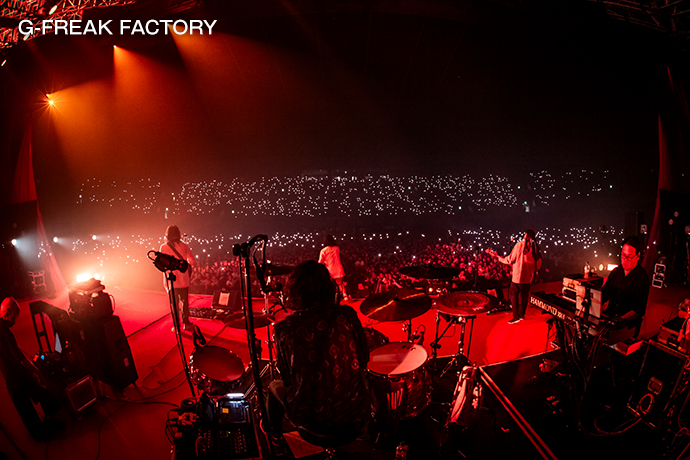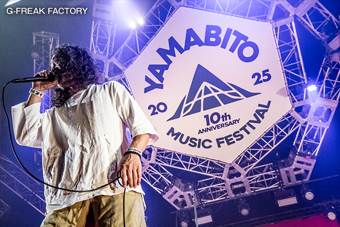 "山人音楽祭 2025 ~10th Anniversary~"もいよいよ大詰め。トリを飾るG-FREAK FACTORYを前に会場の興奮はピークに到達した。楽器陣のセッションのなかで茂木が姿を現し、"やるかやらねぇか。できるかできねぇか"と口上を切って「SOMATO」へ。声を張り上げ、拳を突き上げて音に応えるオーディエンス。途切れない熱量とダイバーの中、「WHO UNCONTROL」、「Parallel Number」と重ねていく。観客と共にライヴを作り上げた「Too oLD To KNoW」、"マイノリティでも全然構わねぇ。それを信じ合う空間を作りたい"と言ってスタートした「HARVEST」、BRAHMANのTOSHI-LOWと共に歌った名曲「ダディ・ダーリン」。「Fire」で全員が魂を燃やし、その後茂木が1人だけステージに残って放った言葉の数々で胸を撃ち抜き、アンコールの「らしくあれと」を残る体力全てを使って走り抜く。