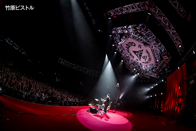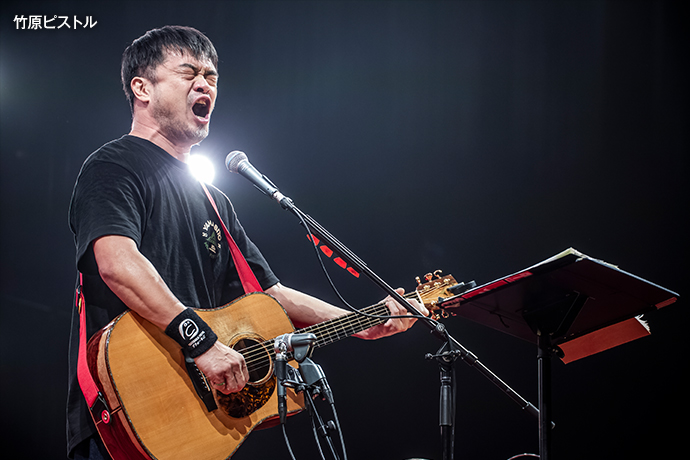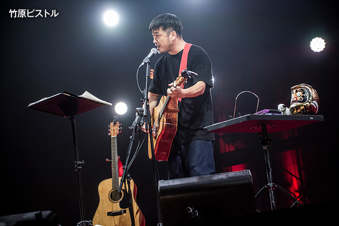 ギター1本を手にステージに立つ竹原ピストル。汗を滴らせながらギターを掻き鳴らし、魂のこもった歌で時間を紡いでいく。「よー、そこの若いの」を観客と一緒に歌い、「Forever Young」の後、まるでラップのようにそのときに生まれた言葉を重ねていく「啖歌」で終えるライヴで、心を鷲掴みにされた。