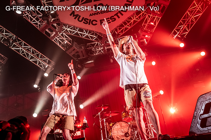 リハーサルから大暴れした四星球。G-FREAK FACTORYのかわいいところベスト3を発表した「なんでもかんでもランキング」で盛り上げ、その流れのままG-FREAK FACTORYのメンバーを交えて「恋するフォーチュンクッキー」(AKB48)のカバーでさらに盛り上げる。10周年を祝いつつ、さらに10年後への想いを託した愛のあるステージで、会場はいっぱいの笑顔で満たされた。