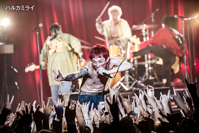 橋本 学(Vo)が客席に入り、そのまま「君にしか」でスタートしたハルカミライ。「カントリーロード」、「ファイト!!」と続けてダイバーが続出する。橋本が"俺等もあんなふうに年を取りたい"とリスペクトを口にし、"全員で「山人」作ろうぜ!"と叫んで客席から大歓声。想いが溢れた全身全霊のライヴは見事だった。