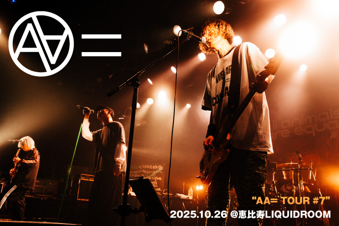 アンコールでは、BUCK-TICK(現BUCK∞TICK)のカバー曲「NEW WORLD」、「LOSER」、そしてアルバム『#7』のラスト・トラック「ALL ARE UNITED」が披露された。「PEACE!!!」や「ALL ANIMALS ARE EQUAL」等と同様に、この「ALL ARE UNITED」もライヴの最後に演奏され、来たるライヴや続く明日への布石となっていく曲になるのだろう。曲が終わりメンバーを見送った上田は、"最高だった。LIQUIDROOM、またやろうね"と語り、また年内のライヴも匂わせながら"みんなにとっての明日がいい日であることを祈ってます。AA=でした"と締めくくった。この日会場を出る観客にはフライヤーが配布され、12月13日にF.A.D YOKOHAMAでのライヴ「AA= TOUR #7 extra -VERY MERRY DISTORTION DAY- 」の開催がいち早く知らされた。痺れるような歪みを爆音で浴びる年末となりそうだ。