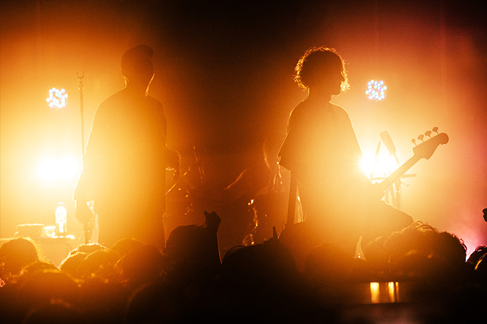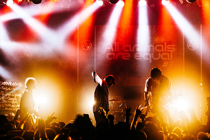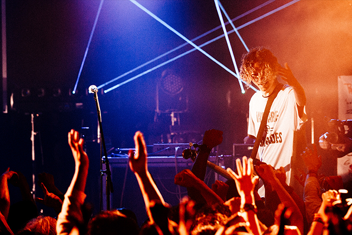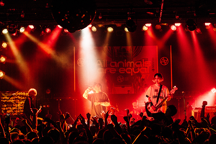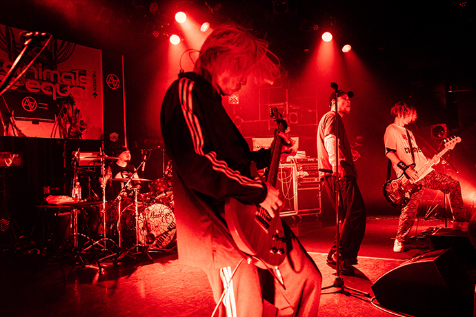 激しいストロボとSE、そして大歓声が会場に響き渡る中、まずはYOUTH-K!!!(Dr)と上田剛士(Ba/Vo/Prog)が登場し、ダイナミックなビートと共にアルバム『#7』のオープニングを飾る「BLUE & YELLOW」で観客と一体となって"STOP THE WAR"のシュプレヒコールをあげた。児島 実(Gt)、白川貴善(Vo)が加わって体がビリビリと痺れるバンド・アンサンブルを聴かせ、そのまま"WAKE UP 恵比寿!"という上田の声で、「WAKE UP NOW (DROP THAT SxxT)」でシンガロングを巻き起こす。歪み系のエフェクターをデザインしたアルバムのアートワークが大きなバックドロップとなっており、歪みのサウンドをさらにブーストする感覚だ。マシンガン的に放たれるビートとヴォーカルで熱狂を生んでいく「KURUU SONG」からいっそう歪みを増した「FIGHT & PRIDE」へと続き、『#7』での流れを落とし込んだセットリストとなった前半。「FLY」では、白川が沸騰し続けるフロアへとマイクを向けて煽りながら、観客のシンガロングのボリュームを上げていった。観客は、重みのあるビートやリフを全身で受け止め続けることで、一段とエネルギーを増しているようだ。曲間にはフロアから、"もっと来い!"という声も飛んでくる。