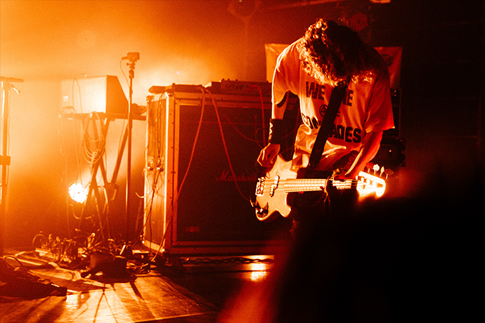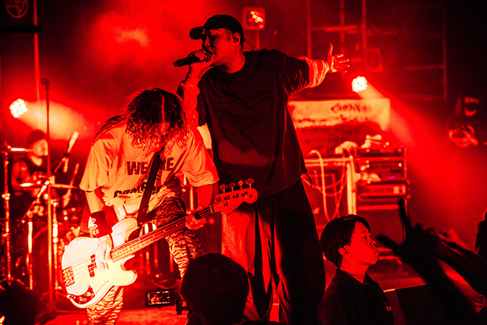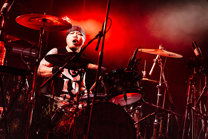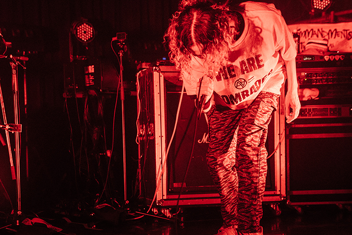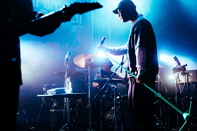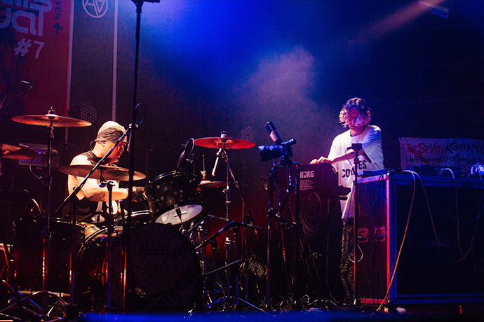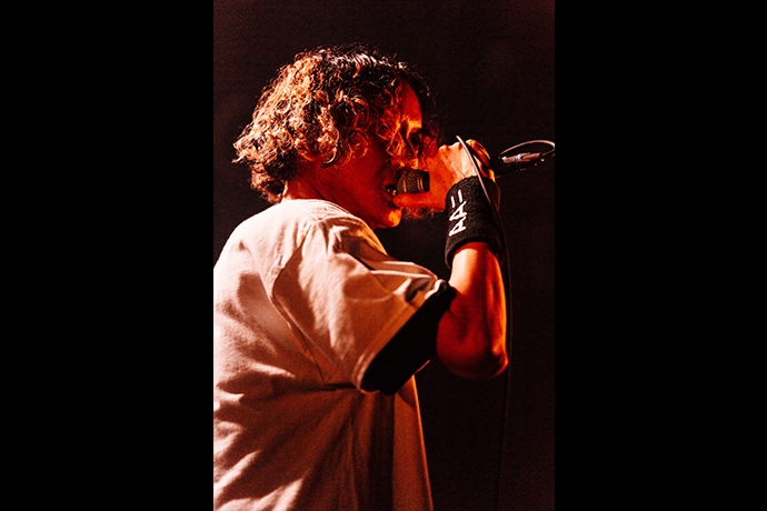 さらに終盤では、アルバム『#7』での曲に加えて、ライヴでのテッパン曲も織り交ぜながら一気にクライマックスへと駆け上がっていった。口火を切ったのはブルータルなビートとギター、シャウトでフロアをかき混ぜる「THE OLD BLOOD CLASSIC!!!」だ。また、YOUTH-K!!!のドラム・ソロ・パフォーマンスでダイナミックに魅せてからの「BE LOST...」も、音源でのアブストラクトなムードともまた違う、スリリングで迫力のあるものとなった。ちなみに今回のライヴでは「BE LOST...」でフィーチャリングしたSHIGE(WRENCH/Vo/Syn)の出演はスケジュールの都合で叶わなかったが、それはまた別の機会でということなので期待したい。「posi-JUMPER」等フロアの興奮の密度が増すテッパン曲を連投し、ラストに据えたのは「THE BOMB」。大団円で締めくくるというよりも、最後にきてなお声を枯らして叫びを上げ続ける曲であったことにも、今回のツアーの勢いが伝わってくる。それぞれの様々な歪み、ノイズを掛け合わせ、その瞬間のケミストリーを楽しむ"ライヴ"となった。