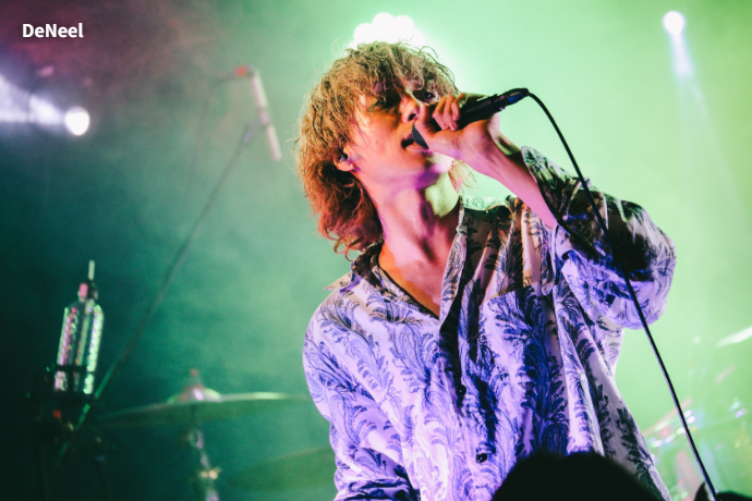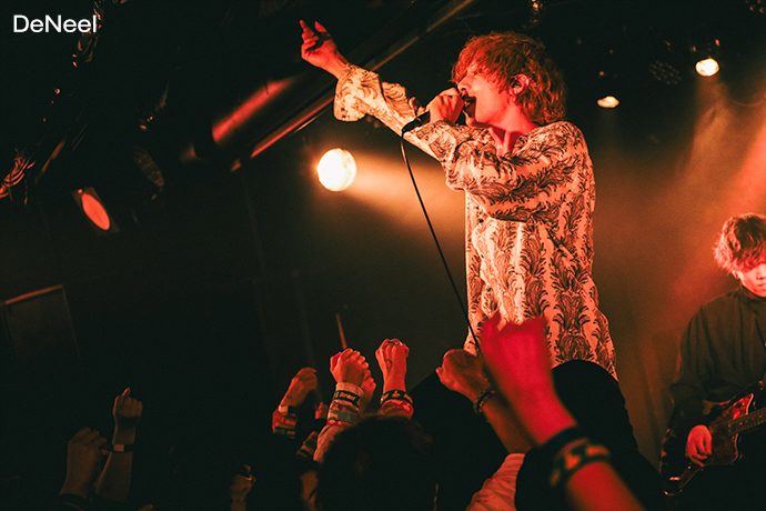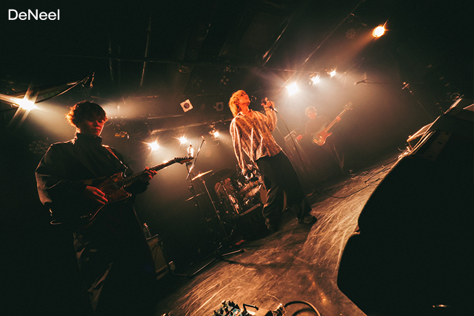 SHIBUYA THE GAMEのトップバッターは、4人組新鋭バンド DeNeel。熟れたリンゴのように赤黒い危うげな照明を背に「富と果実」を披露すると、モダン且つダンサブルなサウンドでフロアを揺らす。そのまま日野ユウキの叩くスネアとバスドラによる疾走感が爽快な「ライムライト」へと繋ぎ、「カオス」では中野エイト(Vo)が回すタオルを客へ投げ込んだり、浦野リョウヤが中央で力強いスクラッチからのギター・ソロで盛り上げたりする姿に自然と手が挙がる。ロカホリとの馴れ初めについて中野は"ロカホリで飲むこともあるんですけど、下北の店長とは別の飲み屋で会って仲良くなったこともあって今日トッパー務めることになりました"と語った後、"ド直球にかっこいい曲もあるところ見せます"と始めた「導火」で歌詞にもあるように後半戦開始の旗を上げた。そのままMCなしで"霧の中でもがいている"という歌詞が会場に満ちるスモークと重なる「存在A」、龍野リョウが中野の立ち位置を奪うように前面に出て激しいベースを掻き鳴らした「Vision」、「カナリア」と披露し、"15周年おめでとう、また20周年で!"とライヴを締めた。