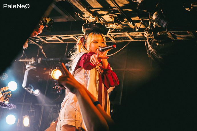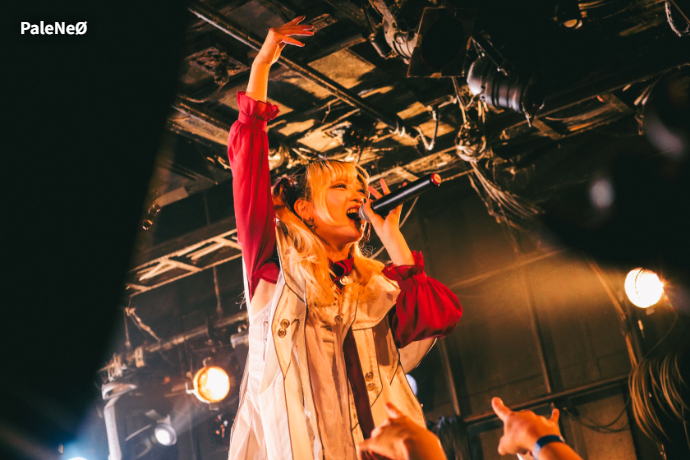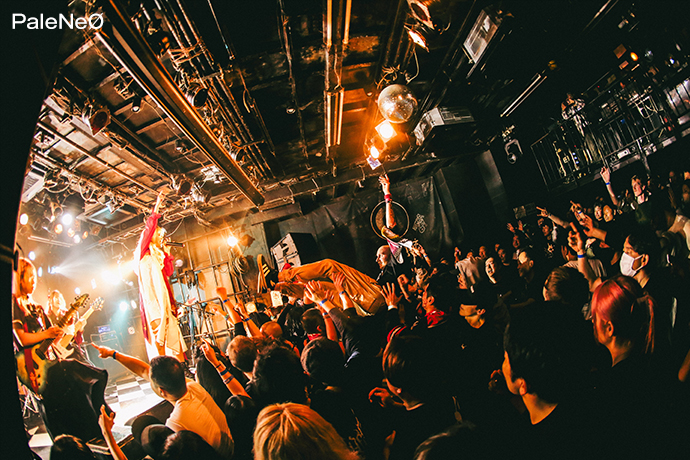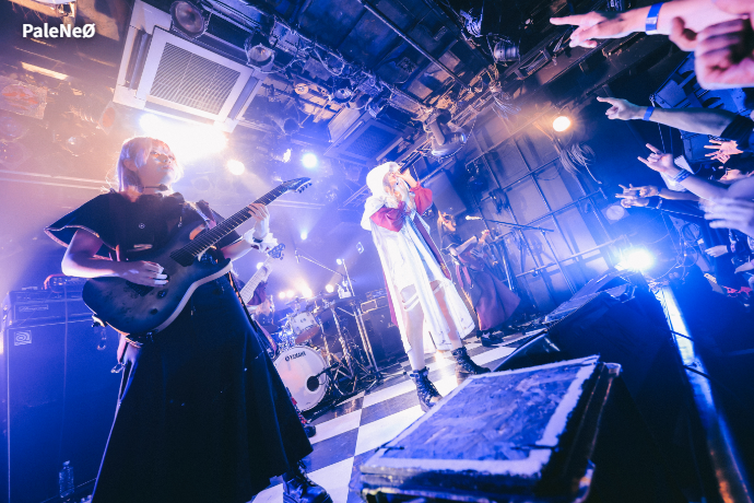 PaleNeØのステージは、まさに曲名の通り、テンションの上がり方を急加速させるのにうってつけのキラーチューン「アレグロ」からスタート。パワフルなほほ美と凛としたREOTOのそれぞれの歌声が生むハーモニー、AYARIの魅せるギター・ソロ、YONAの骨太なベースに、場内の熱はすっかり上がり切っている。"生贄を上げろ!"というほほ美の命令を受け早速リフトが発生すると、"走れ!"とそのままサークル・ピットが巻き起こった「Crowd Surf Rider」、そして「Moment.」からMCへ。ロカホリ15周年への祝辞に続き、激ロック12月号より彼女たちのコラム連載が開始することが発表され、お祝いムードがさらに爆発。その勢いをますます高めるように「f -フォルテ-」、「aLiVE」と、ヘヴィネスと爽快感を併せ持った楽曲たちが畳み掛けられる。最後はフロアに特大のモッシュ・ピットを作り出した「ギルガメシュ闘争記」でフィニッシュ。どこまでも熱量が高まり続けるなか彼女たちのセットが幕を閉じた。
