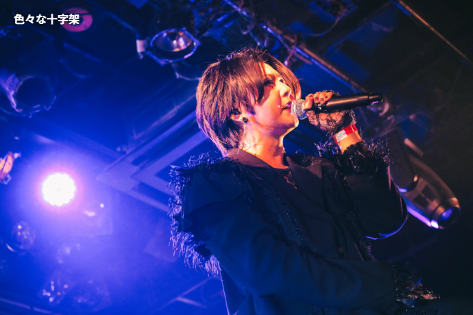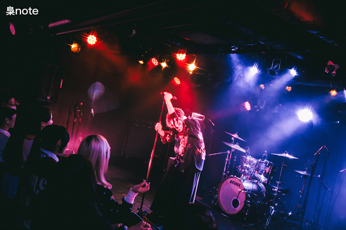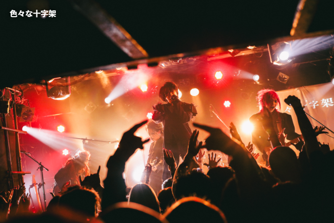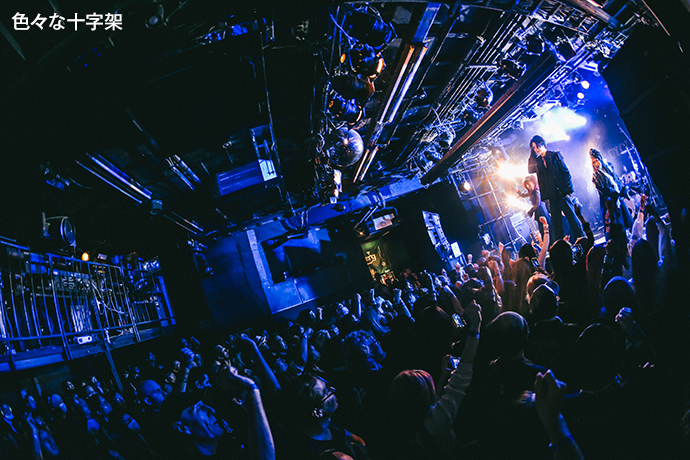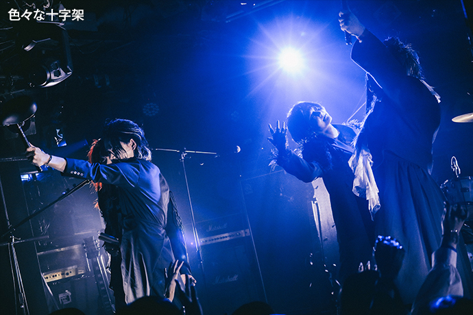 色々な十字架がオープニングに選んだのはミディアム・バラード「LOST CHILD」。緊張感も漂うメランコリックなギターの旋律がCYCLONEに響き渡るが、tinkの歌が始まり、ステージ上手後方にその歌詞がプロジェクターで映し出されると、サウンドとのギャップに思わず笑いが込み上げる人も。そこで掴んだ心をそのまま彼等の世界観に引きずり込むように、タイトルコールをした上で、メロディアスでキャッチーな「TAMAKIN」、そして白熱した一輪車バトルを描いたミュージカル曲「GTO」へなだれ込む。misujiとdagakiはそれぞれベースとスティックをサドルに、tacato.とkikatoはギターをバチに持ち替え、tinkが"GTO!"とコールを煽る頃には、彼等を初めて見るというオーディエンスも巻き込んで会場が1つになっていた。「凍らしたヨーグルト」でそのハイクオリティな演奏と独特すぎる詞世界をさらに堪能させた後は、暴れ曲「かなり耽美(決定)」でエネルギーを存分に発散させ、ラストへ繋いだ。