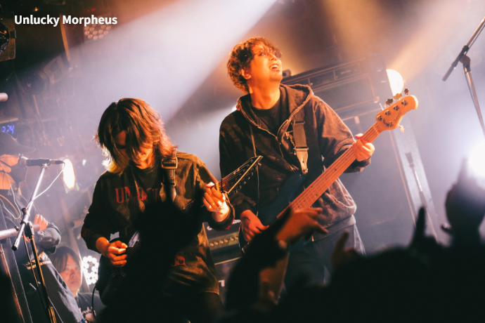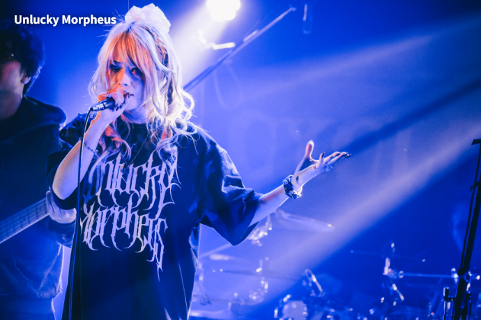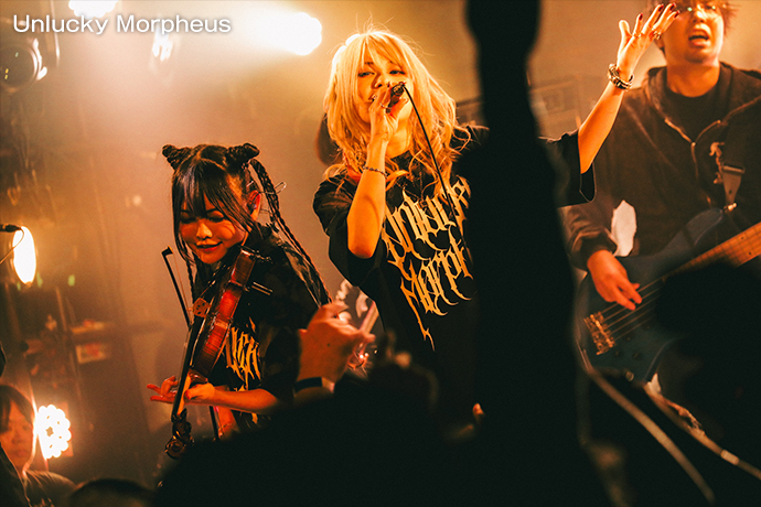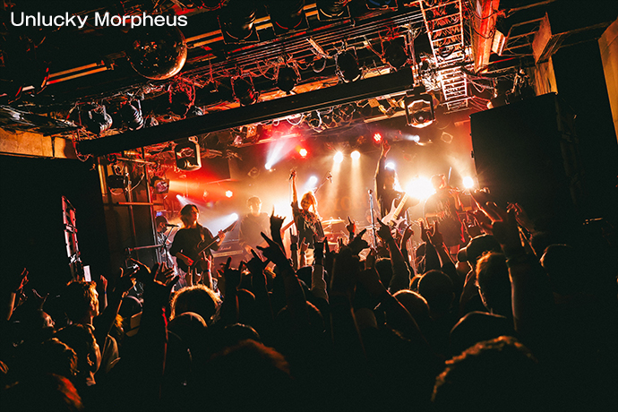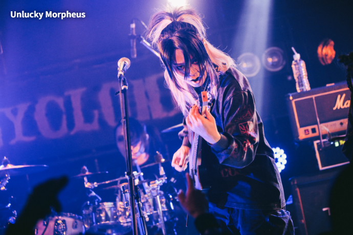 CYCLONEおよび本サーキット・イベントのトリを務めたのはUnlucky Morpheus。「世界輪廻」のテクニカル且つ重厚、それでいてポップなアンサンブルで、聴く者をファンタジックな世界へ誘う。そんなUnlucky Morpheusはロカホリより少し先輩で、2028年に20周年を迎える。Fuki(Vo)の"この周年というものを祝えるということは、何より継続あってこそじゃないですか"という言葉から、"「若手」、「最前線」、「次世代」、「次のメタルを担う」、ずっとそれを言われ続けて、言い続けてやって参りました。まだまだ次のステージを皆さんに見せていきたいと思います!"と披露された「Ready for a new stage」は、まさに長く愛され続け、これからも歴史を重ねていく双方の未来への祝福に相応しい一曲だった。なお、普段は楽曲の世界観にも合う華やかな衣装で登場することが多い6人だが、この日はロックでラフな装い。激ロックが運営するGEKIROCK CLOTHINGとの5度目のコラボというさらなるニュースに続いて、ラスト・スパートに突入する。イベントの締めくくりを飾った「Black Pentagram」まで、極上のメロディック・メタル・チューンたちでCYCLONEの熱気を最高潮に導いた。