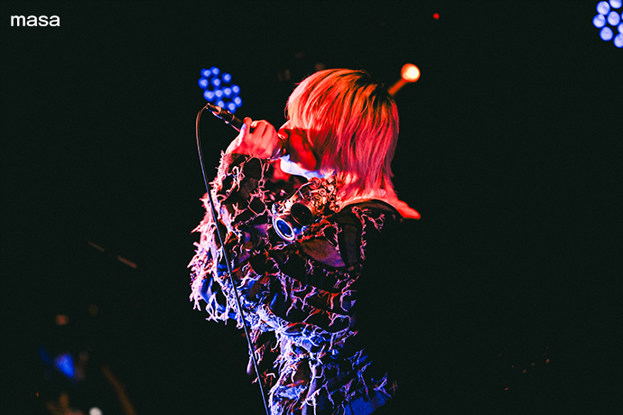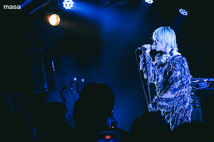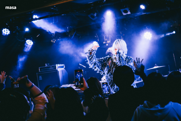 フロア前方の緊張感が静かに高まるなか、シンガー・ソングライター masaがshuri(DJ)と登場する。オープナーは1st EP『000』から「Rewrite」。当時自分を鼓舞するために作ったという本楽曲でDJならではのアレンジも交えながら場を盛り上げた後は、「3AM」、「Deep-sea diver」と暗い孤独な状況に寄り添うエモーショナルな楽曲に繋いだ。フロアとの距離も近く、masaの趣のある透き通った声が響く。"最近寒くなってきたと思うんですけど、スマホ片手に楽しそうですね。(この日のmasaのライヴは撮影可能)"とありがちな話題から突拍子のない話題に繋ぐという小ボケも挟み、この瞬間のライヴを楽しんでいる姿が印象的だった。続いて"人を深く愛すると、その人の身の回りのものをも愛しく思う"という意味の四字熟語が冠された「愛及屋烏」へ。"まだ好きだよ"から入るサビでグッと情景が浮かぶ。失恋ソングを続けて披露した後、"ライヴハウスは怖くないから勇気を出して来てくれると嬉しい"と一転して明るい雰囲気の「まいっちゃう」、「とらぶるめーかー★」へ。可愛い振付や合いの手があるファイト・ソングで会場のテンションを上げ切り、爽快感と共に駆け抜けた。