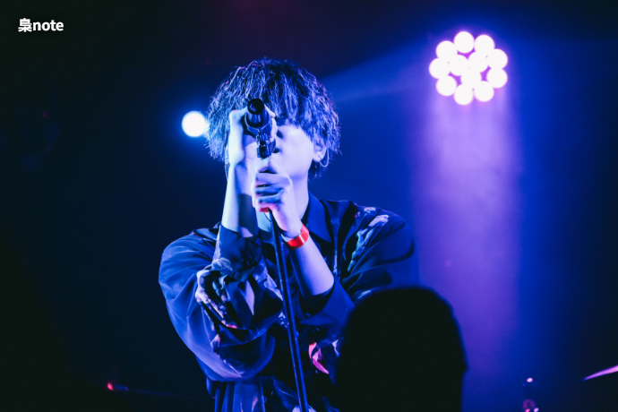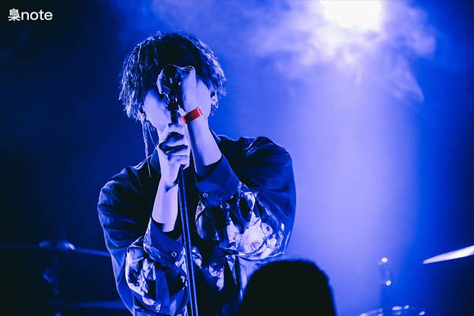 外がすっかり夜の帳に包まれると、ステージにダークな照明とSEが流れシンガー・ソングライター 梟noteのライヴがスタート。彼のライヴを近距離で観られる機会に、老若男女問わず様々な観客が集まっていた。怪しげな雰囲気の中、ピアスを揺らしながらジャジーにそしてセクシーに「女王」を歌い上げる。落ち着いた大人な雰囲気のまま「烏瓜」、「愛ばっかり」と続けてスタンドマイクで披露した。"改めまして梟noteです。歌い手「弱酸性」としても活動しております"と丁寧な自己紹介を終えた後は、テーマがあり珍しく詞先で制作したとインタビューで語っていた「正偽」、主人公の報われない日々を描いた「patience」と続けた。どちらも歌詞には複雑な心境を抱えたストーリーやメッセージ性があるが、メロディやリズムは耳に残る彼のポップ・センスが秀でた楽曲だ。ハンドマイクに持ち替えステージを左右に歩き回り一人一人に歌を届けた後、「君の背中」を爽やかに披露し、"僕の音楽の一部でも皆さんの心に届いていたなら嬉しいです。これからもたくさんの楽曲を届けたいと思います"と「彩られた理想へ」でライヴを終えた。
