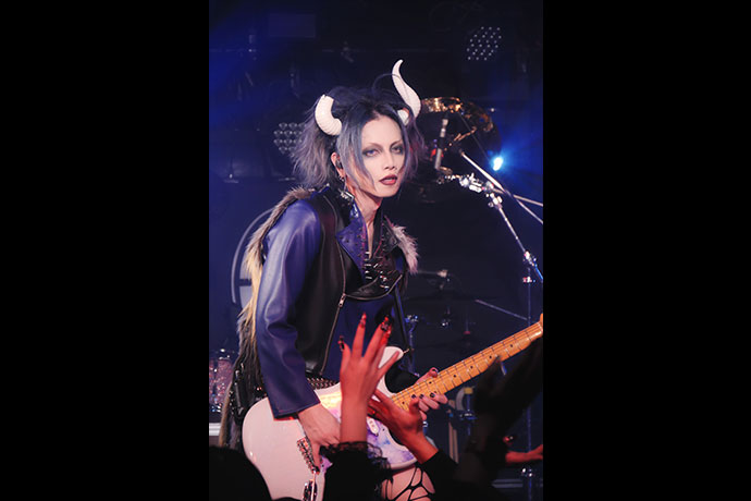 彼等のライヴを観て改めて実感させられたのは、メンバーの圧倒的な個性だ。プレイ・スタイルのみならず出で立ちも......言わば"作画"もまるで異なる5人が、譲れない美学をステージにぶつけ、散る火花の鮮やかさこそがORSEASならではのカラーとなる。額に十字架を刻み、悪の皇帝のようなカリスマ感でオーディエンスを統制するLUM.(Vo)はもちろん、頭から白い角を生やし、凛とした佇まいで躍動感溢れる演奏を繰り出す柳(Gt)、ゴスロリ三つ編みで血の涙を流しつつ、予測不可能且つ狂気的なパフォーマンスを繰り広げるくろ(Gt)からも目が離せない。アンサンブルを支えるリズム隊は、余裕すら感じさせる堂々たる立ち姿が印象的なGoH(Ba)、端正なルックスから高精度でパワフルなドラミングを披露するSeira。目と耳がいくつあっても足りない状態だ。