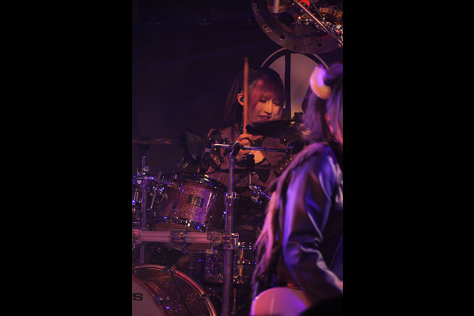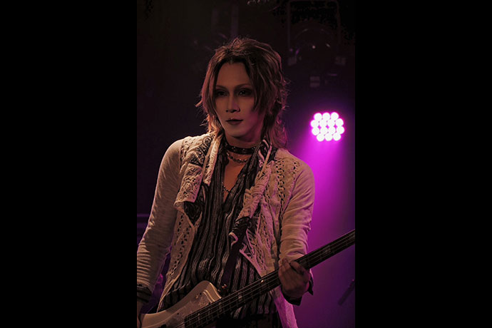 ライヴ序盤に演奏された1stシングル『Crying with Regret』収録曲「哀傷雨」は、2本のギターがツイン・リード的にせめぎ合う一曲。メロディアスなフレーズの応酬で楽曲世界を紡いでいく柳に対して、くろはトリッキーな奏法を見せるばかりか、時には演奏を放棄し振付や表情等視覚でもステージを盛り上げる。そんな煌びやかなギター・サウンドとうねりまくるベース・ラインがコントラストを示す「ガラス玉」は、彼等が掲げる"人の中に必ずある二面性"というコンセプトの説得力を高めていた。