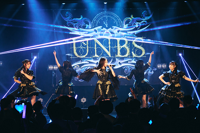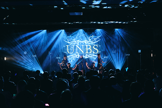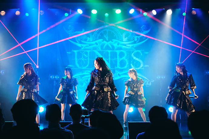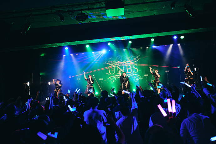 春乃友夢の言葉通り、Shinjuku FACEで開催されたワンマン・ライヴ"UB RISE+"は、UNBSが掲げている"UB ROCK"の最新型をフロアにぶつけ、共有し合う90分間となった。ライヴの開幕を飾ったのは、今年9月に発表したミニ・アルバム『UB RISE』収録の「Phoenix」。真っ白なレーザービームと、ハードながらも流麗なヘヴィ・サウンドが爆音でフロアに放たれ、春乃友夢、今井莉南、上瀬りら、碧葉さり、甘咲りみの5人は力強い歌声を響き渡らせる。