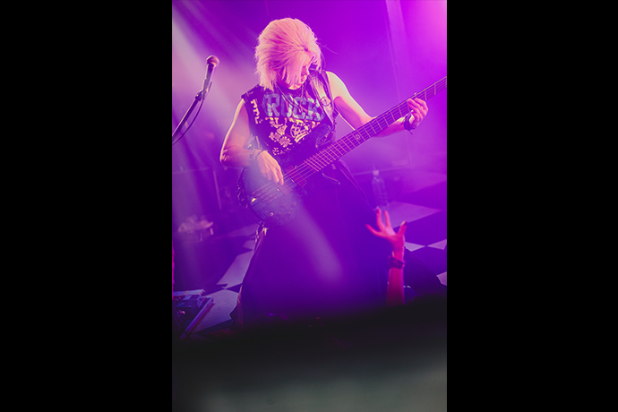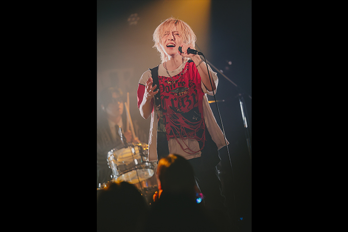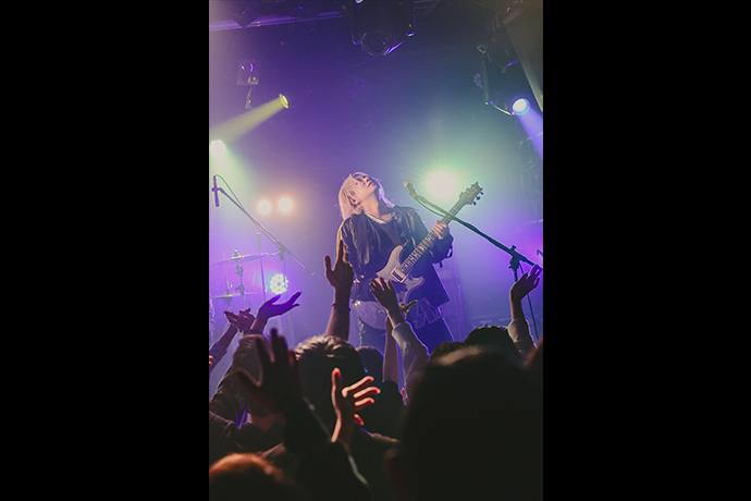ラップにシャウトにハイトーンと、多彩なヴォーカリゼーションを巧みに駆使しつつもオーディエンスを激しく煽り倒すCHISA。クセ強で凶悪な歪みを湛えながらもスッキリとした後口を実現する、イノベーティヴな音像でバンド・サウンドを牽引する将吾(Gt)。ブレイクダウン明けのここぞという場面で、技と魂のこもったベース・ソロで派手にブイブイいわせるRIKITO。乾杯の音頭を取った上で、またとない躍動するリズムでも場をこれでもかと盛り上げまくるHAL。