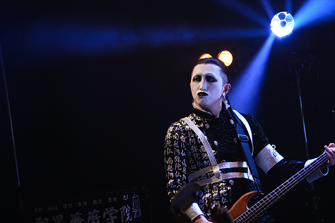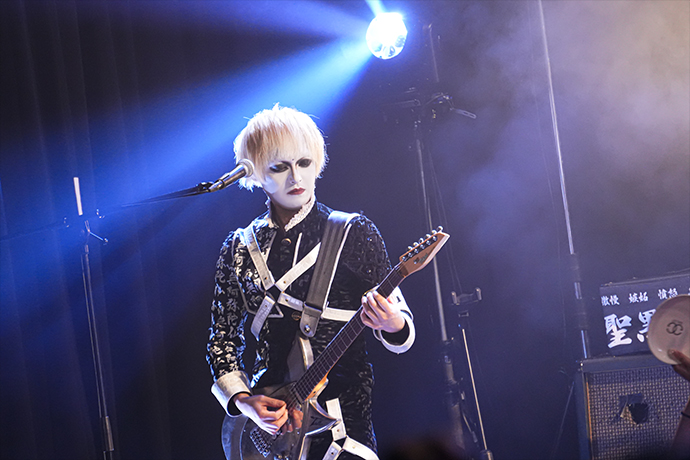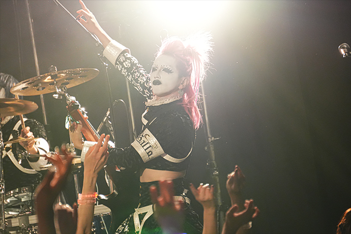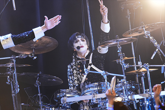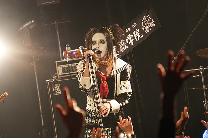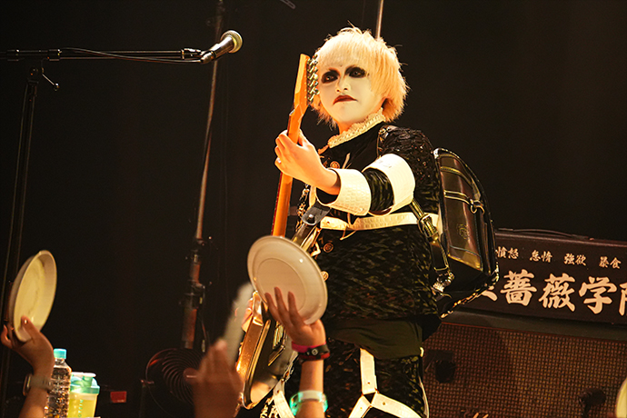 早速メインディッシュを振舞わんと披露された「聖黒薔薇學院-青春-」。セーラー服をモチーフにした衣装を纏ったジョジョが三角木馬に跨り歌うなか、彼等のライヴでの定番アイテムである白い皿と銀のスプーンを持った"雌鶏"(※ファンの呼称)が狂喜乱舞する光景は1曲目にして圧巻だ。ワジョウとノヴのメタリックなツイン・ギターが疾走する「BOOGEYMAN」ではジョジョと共にポーズを決めたり、上手から下手へ、下手から上手へと一糸乱れぬウェーヴを何度も成功してみせたり、まさに会場が一体となってスペクタクルを作り上げていた。