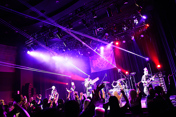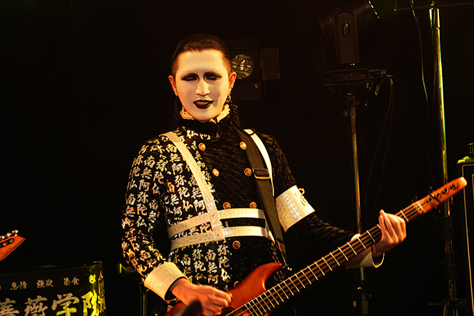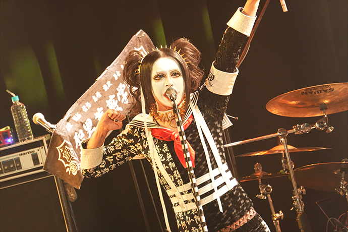 テンポ・チェンジでメリハリを利かせた「蛔蟲」から突入したのは「魔王-粛清-」。ヘヴィなリフにジョジョのシャウトが乗り、場内の熱量を一気に高めていく。楽器隊にスポットを当てた「葬魔-LUCIFER-」に続いた「東京市下谷区少年盗賊團・虎徹」では彼等のコーラスが曲の盛り上がりをさらに増強していて、フロアはもちろん、ステージに立つメンバーも表情やステージングからこの時間を楽しんでいたことが、筆者が座っていた2階席までビシビシと伝わってきた。