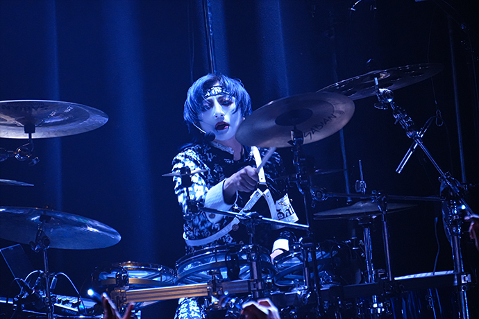 "本当に楽しい時間というのはあっという間なんだからな!"とジョジョが煽る通り、気が付けばもう本編も終盤。熱いギター・ソロの応酬やユニゾンにテンションが上がらないはずがない爆走チューン「VILLAIN-JOKER-」、カエデが跳ねるリズムから怒濤の勢いのビートまで自在に刻みながら歌でも魅せた「淫魔-BELPHEGOR-」、そして不気味さも激しさも併せ持った「魔王-闇詩-」でラスト・スパートを掛けていったが、"雌鶏"たちがそのままメンバーを帰すわけもなく。皿にスプーンを叩き付け、"おかわり"という名のアンコールを要求する。