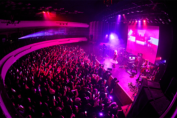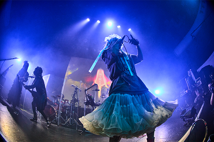 白いフリルの衣装に身を包んだ京(Voice)が登場し歓声を巻き起こすと、1曲目は「Scarlet」。耽美なサウンドとファルセットが妖艶な世界を静かに押し広げていく。そのサビでハイトーン・ヴォイスが空気を切り裂くと、あたり一面に花が開くように腕が上がり舞った。未架(Dr)のヘヴィなグルーヴ、utA(Gt)のディレイ・フレーズ、匠(Gt/Pf)の流麗なソロ、YUCHI(Ba)のスラップ......5人で時間をかけて空間を染め上げていくような、幕開けに相応しい一曲だ。演奏は鳴り止んだが依然として異様な緊張感が充満していて、物音一つ立たない。