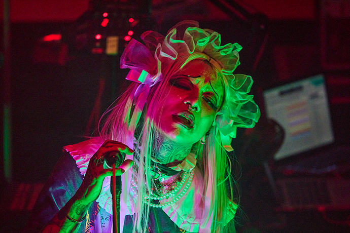 息を呑むような幻想、皮膚を剥がした先に隠れる欲望を描いた先で、ライヴはいよいよ狂乱の宴に突入。「Creeper」は、ルッキズムを加速させる現代社会をピース・サインと共に皮肉る一曲。京はその疑念に共鳴するオーディエンスを手招きすると、次曲「猥雑」にて、すでにすし詰め状態のフロアに女声で"もっと詰めて"といたずらっぽく投げ掛けた。誰もが我を失い、頭を振り乱している。