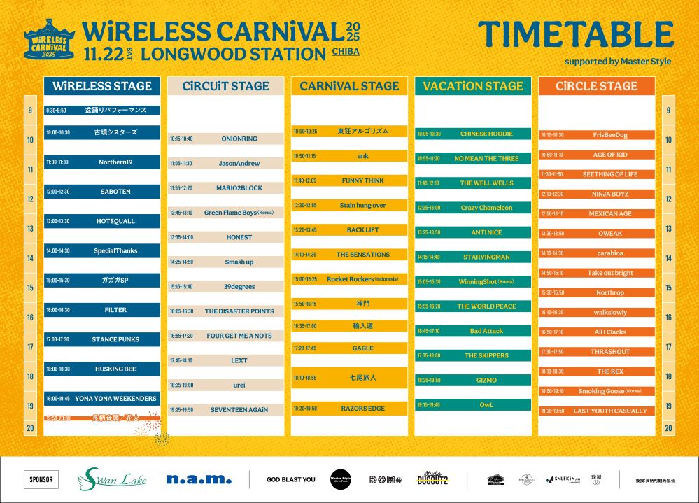 11/22開催野外音楽フェス"WiRELESS CARNiVAL 2025"、タイムテーブル公開!ガガガSP、ホスコ、BACK LIFT、フォゲミ、スペサン等全61組の出演時間を網羅!