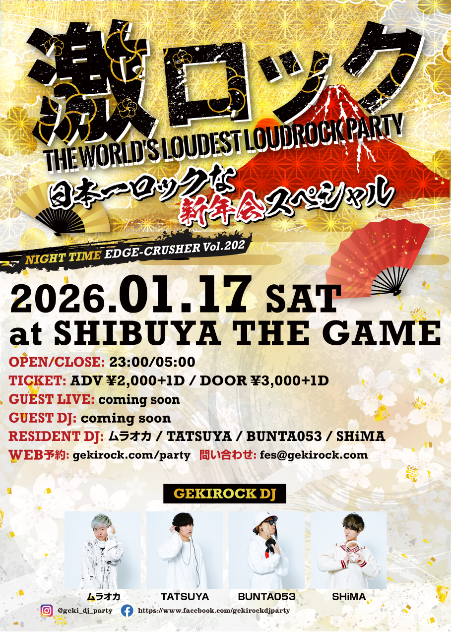 2026年1月17日(土)激ロックDJパーティー@渋谷THE GAME~日本一ロックな新年会スぺシャル~開催決定!新年1発目として盛大に開催されるので是非ご来場頂きたい。