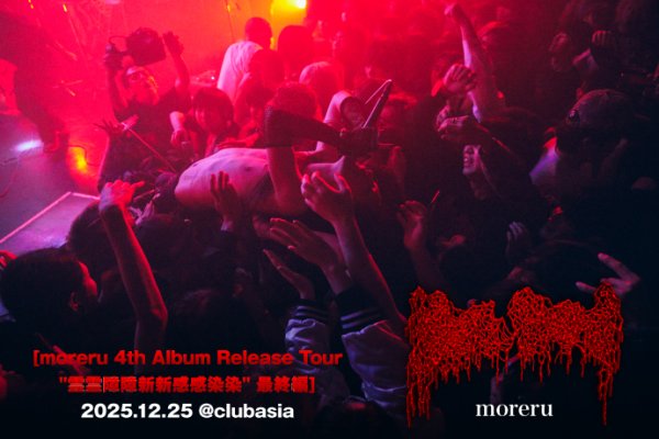 4thアルバム『ぼぼくくととききみみだだけけののせせかかいい』が生んだ傷をさらに深く抉るかのごとく、暗黒祭典"evilspa"を含む日程で全国を回ったリリース・ツアー[moreru 4th Album Release Tour "霊霊障障新新感感染染"]。そのファイナルとなる本公演は、キャリア初のワンマンに。ライヴは途中休憩を挟んだ2部制で行われ、ディスコグラフィを大きく二分することで、最新作での彼等の変化がもはや取り返しの付かないものであることを決定付けた。