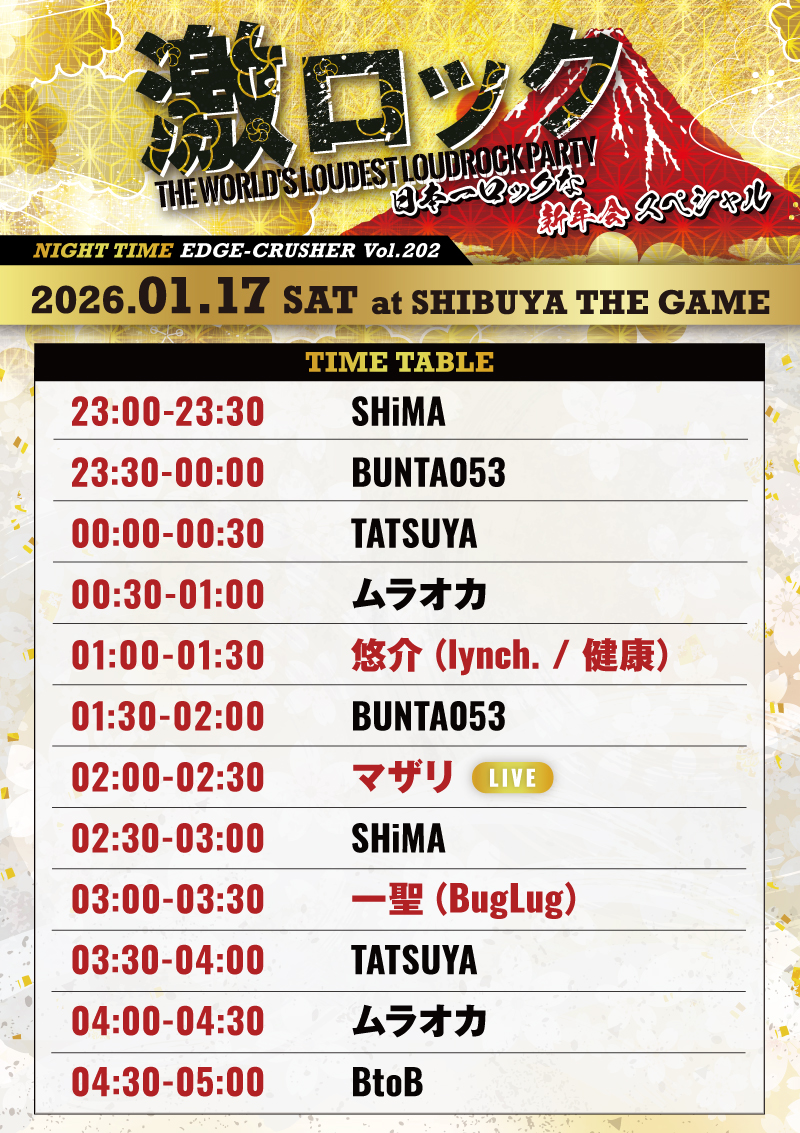 悠介(lynch./健康)、一聖(BugLug)、マザリ ゲスト出演!1/17(土)新年1発目の"東京激ロックDJパーティー @渋谷THE GAME~日本一ロックな新年会スぺシャル~"タイムテーブル公開!チケット好評予約受付中!