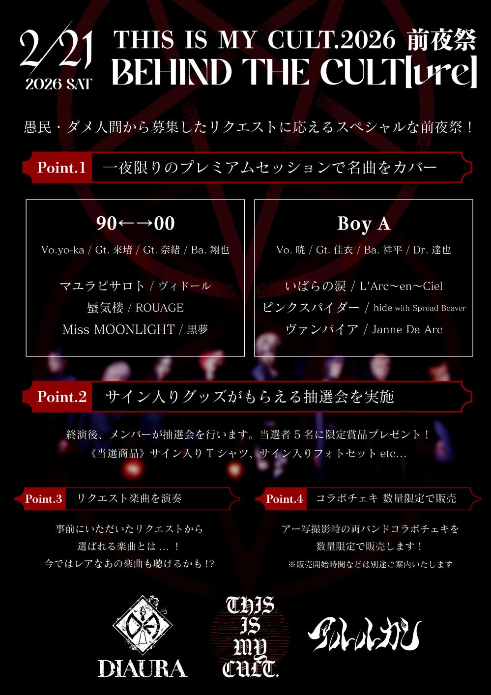 2月に恵比寿 LIQUIDROOMにて、DIAURAとアルルカンによるツーマン・ライヴ"THIS IS MY CULT.2026"が2日間にわたって開催。その幕開けを飾る前夜祭"BEHIND THE CULT[ure]"では、ファンから寄せられた熱いリクエストに応える、一夜限りのプレミアム公演が開催される。