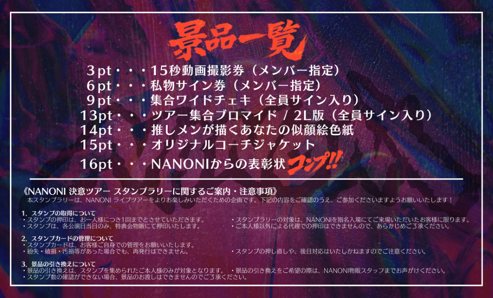 ※本スタンプラリーは、各公演当日の特典会物販にてスタンプを押印いたします。なお、本企画はNANONI指名入場でご来場のお客様を対象としております。