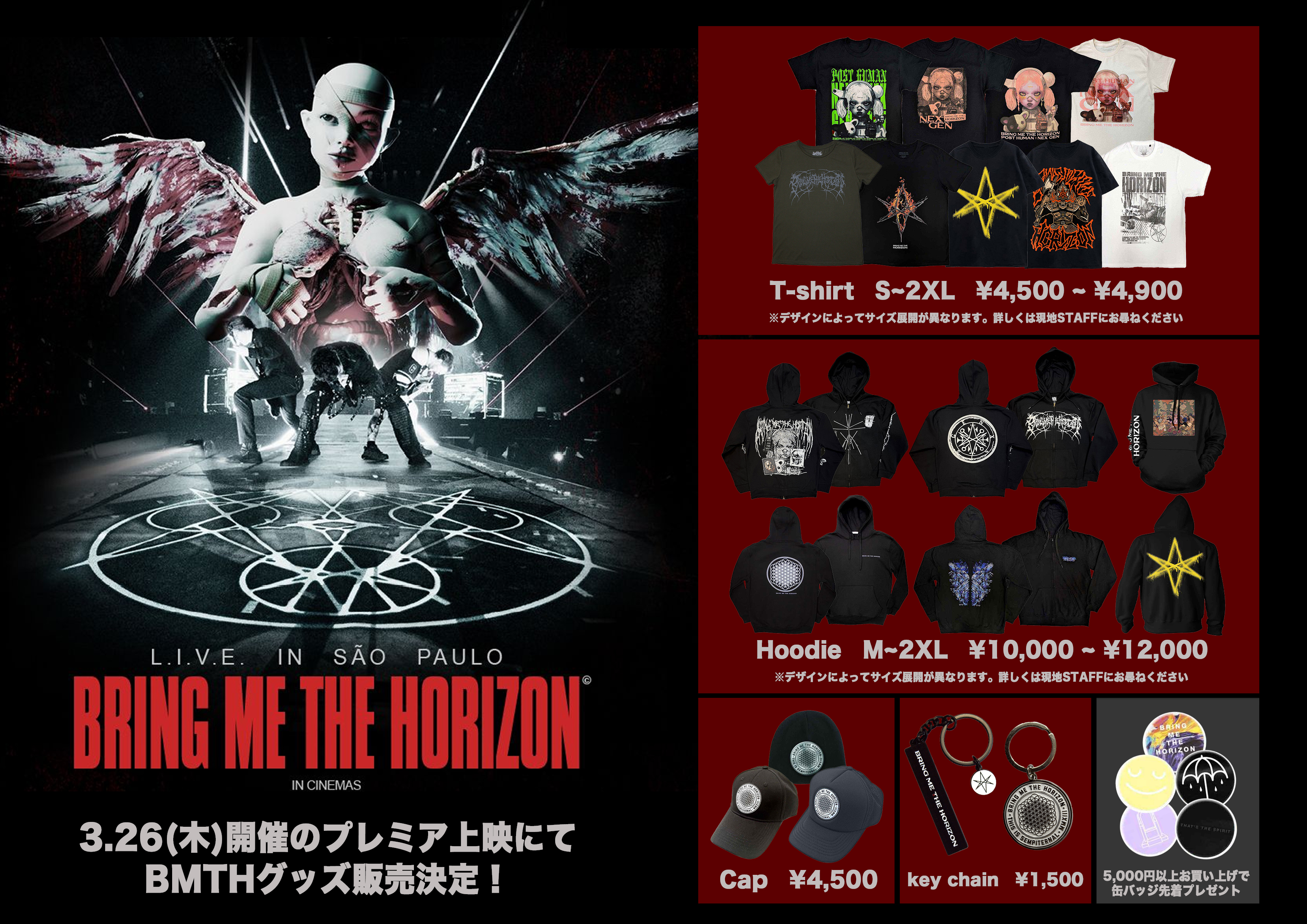 3月26日(木)品川でのBRING ME THE HORIZONライヴ・フィルム上映会場に、GEKIROCK CLOTHINGブース特別出店が決定! 人気バンドTシャツやパーカーの現地販売を実施! さらに当日会場にて5,000円(税込)以上ご購入で、ノベルティとして缶バッジを先着プレゼント! この貴重な機会にぜひお立ち寄りいただきたい!