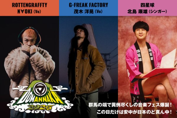 群馬県前橋市で"山人音楽祭"を主宰するG-FREAK FACTORY。このたび、茂木洋晃(Vo)が実行委員長となり、茂木と原田季征の出身地である群馬県安中市にて、安中市合併20周年記念事業"DOMANNAKA2026"が開催される。碓氷峠に位置する"碓氷峠の森公園"で実施され、トロッコ鉄道を利用したり線路を歩いたりして会場に向かえる他、露天風呂からもライヴが聴けるという、異例だらけのこのフェス。開催を記念して行われた今回の座談会では、茂木が"真っ先に声を掛けた2組"と明かす、ROTTENGRAFFTYのN∀OKI(Vo)、四星球の北島康雄(シンガー)と共に"DOMANNAKA2026"に懸ける想いや期待を語り尽くす。